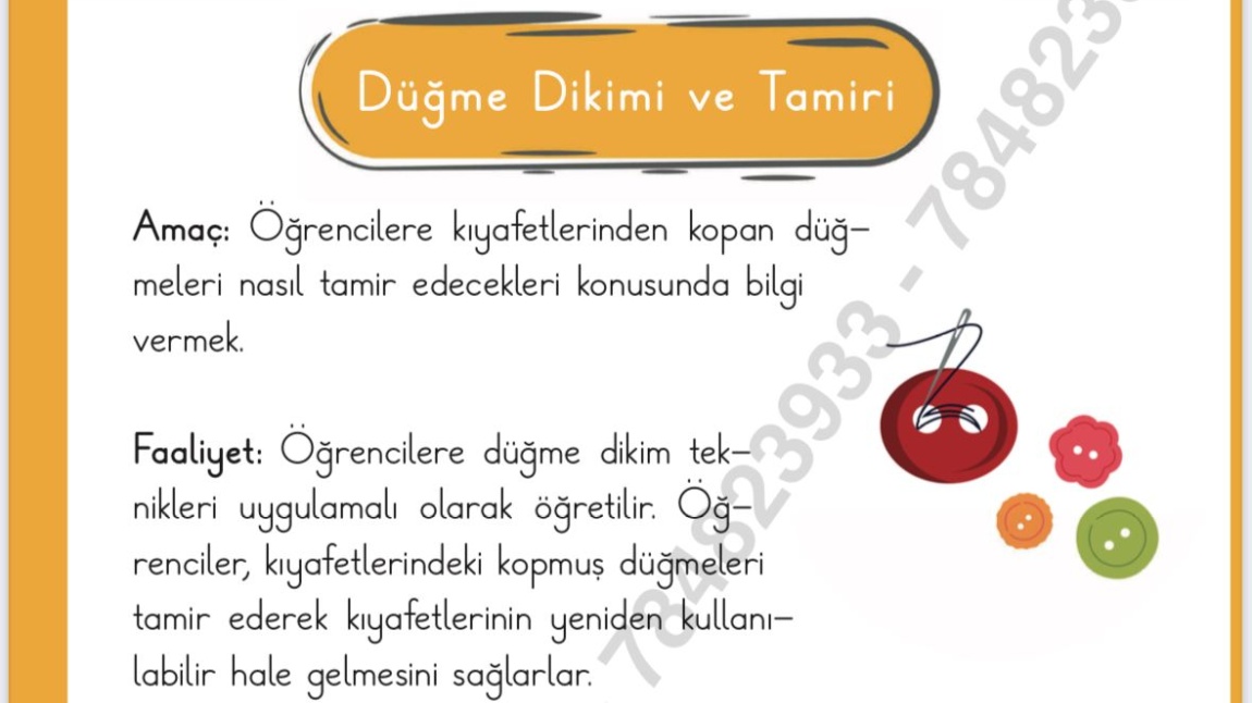 Yaşam Becerileri Projesi Kapsamında 6/C sınıfındaki Öğrencilerimiz ile birlikte "Düğme Dikme " etkinliği yapıldı.Öğrencilerimiz bu kapsamda Kıyafetlerindeki Düğmeleri tamir ederek,tekrar kullanılabilir hale getirebileceklerdir.